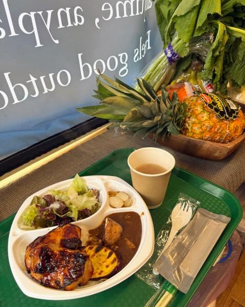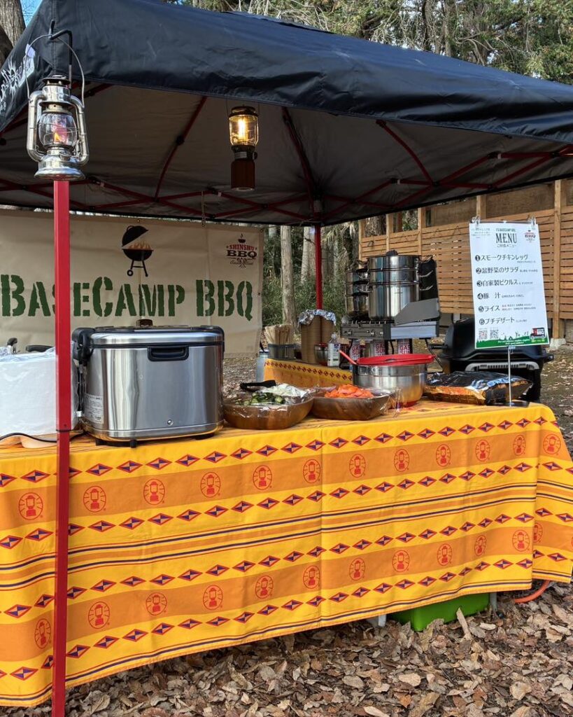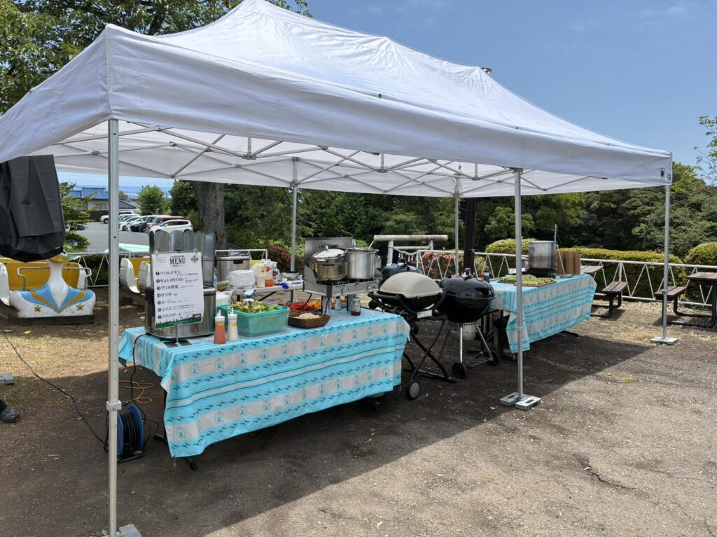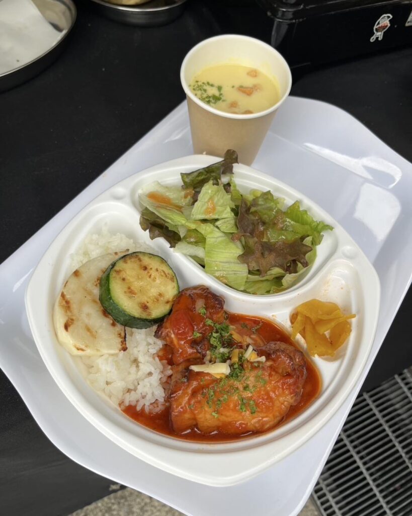 近くの駐車場を確保し、そこでガス釜を使ってご飯を炊き、IH調理器やホットプレートを駆使して対応しました。煙も出ないようメインは煮込みハンバーグです。