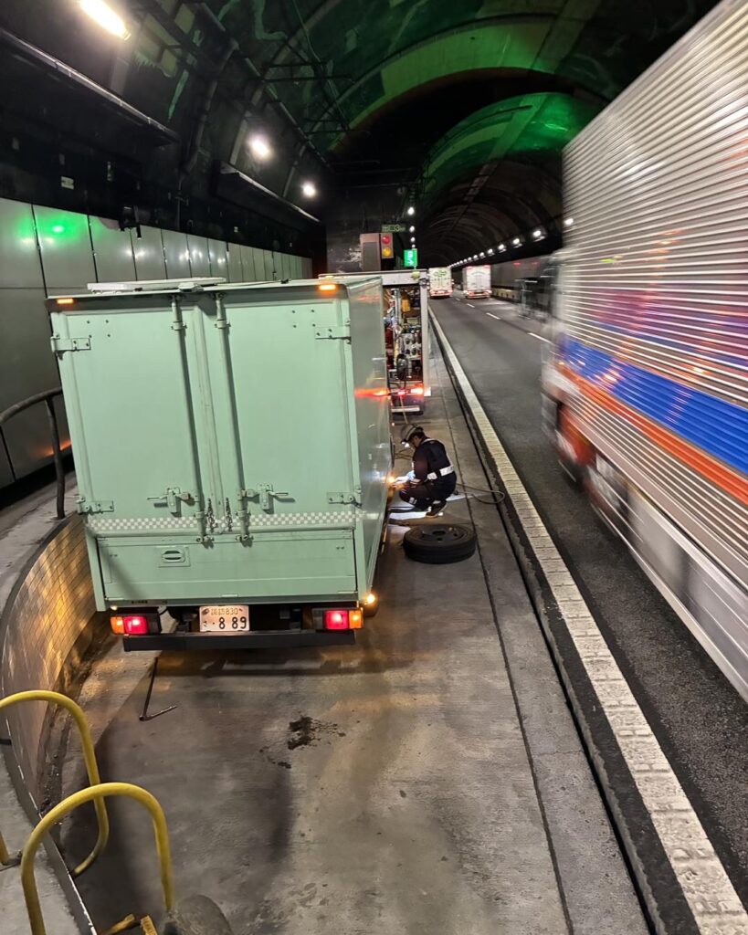 サービスマンのすぐ後ろを大型トラックがブンブンと走る中、手際の良い作業には目を見張るものがあり、プロフェッショナルを感じました。
