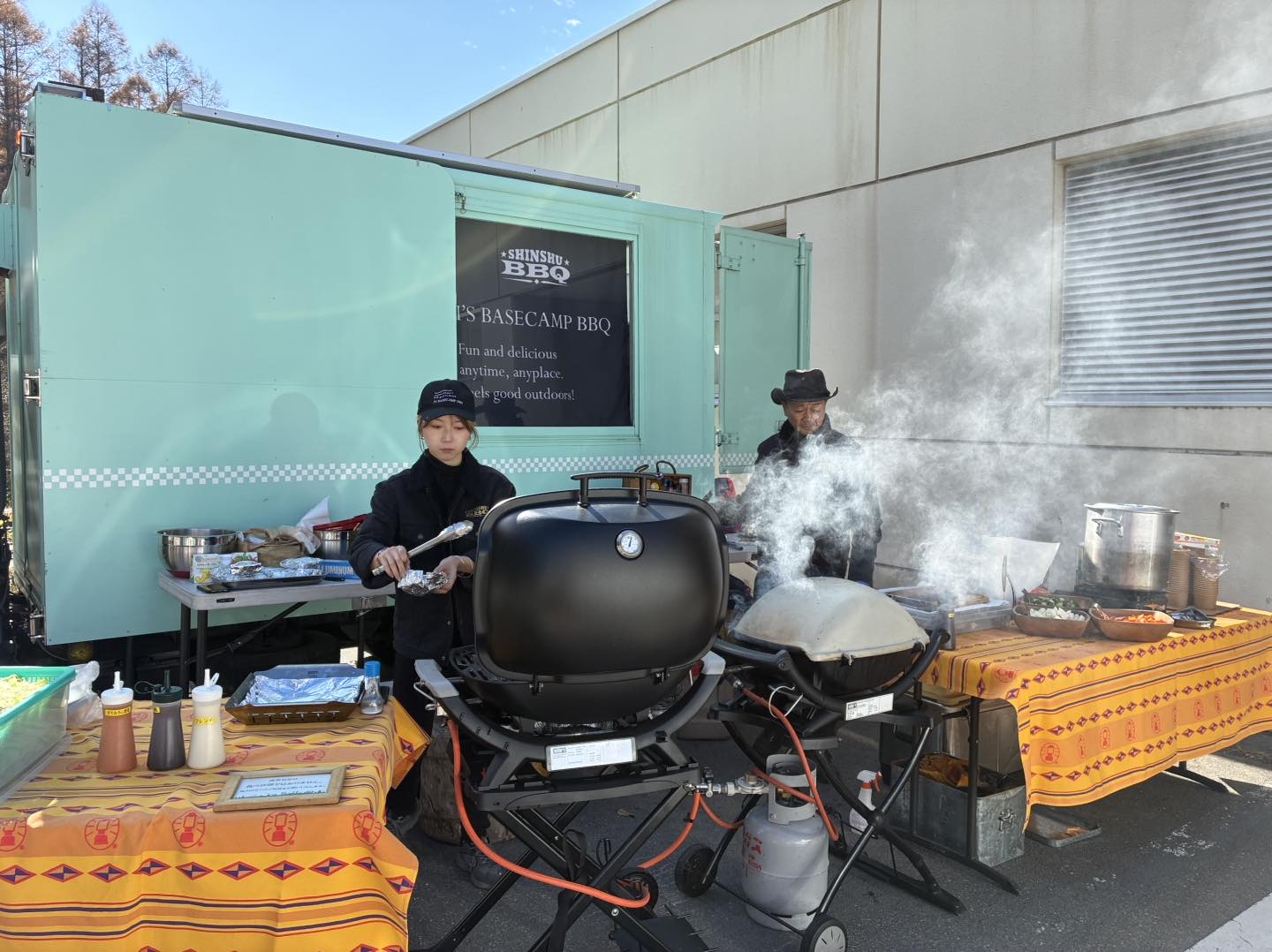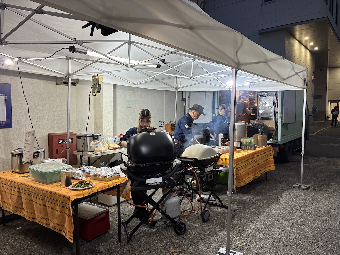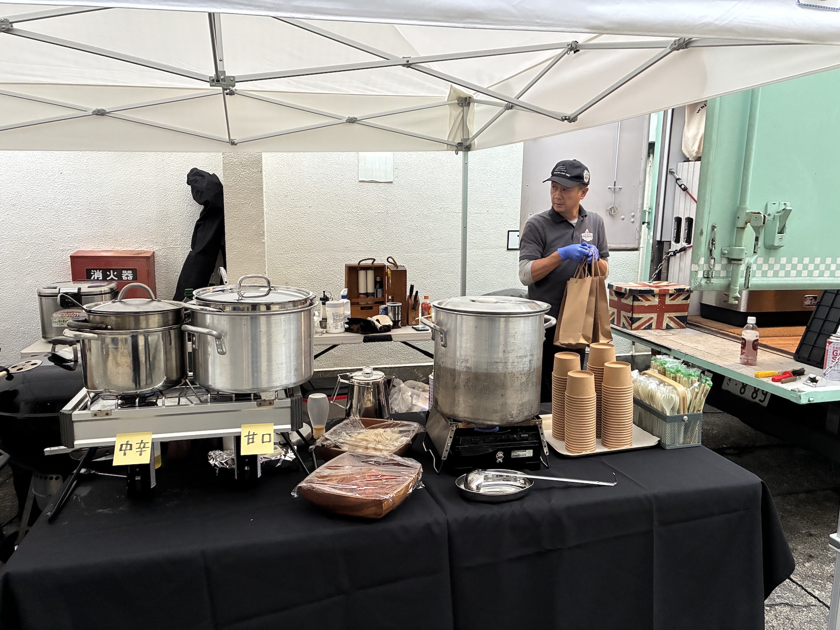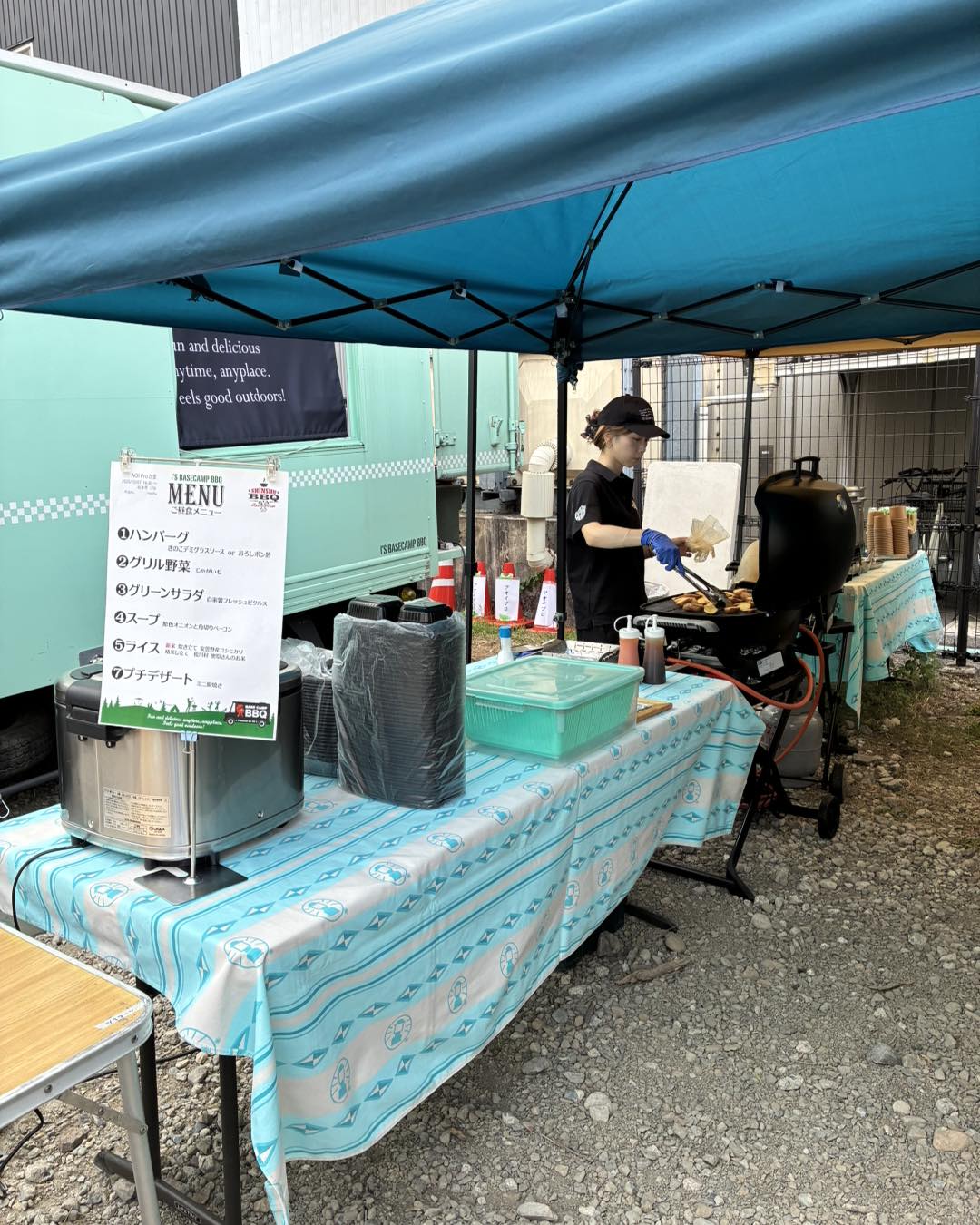 近くの駐車場を確保し、そこでガス釜を使ってご飯を炊き、IH調理器やホットプレートを駆使して対応しました。煙も出ないようメインは煮込みハンバーグです。